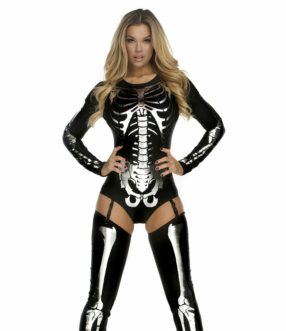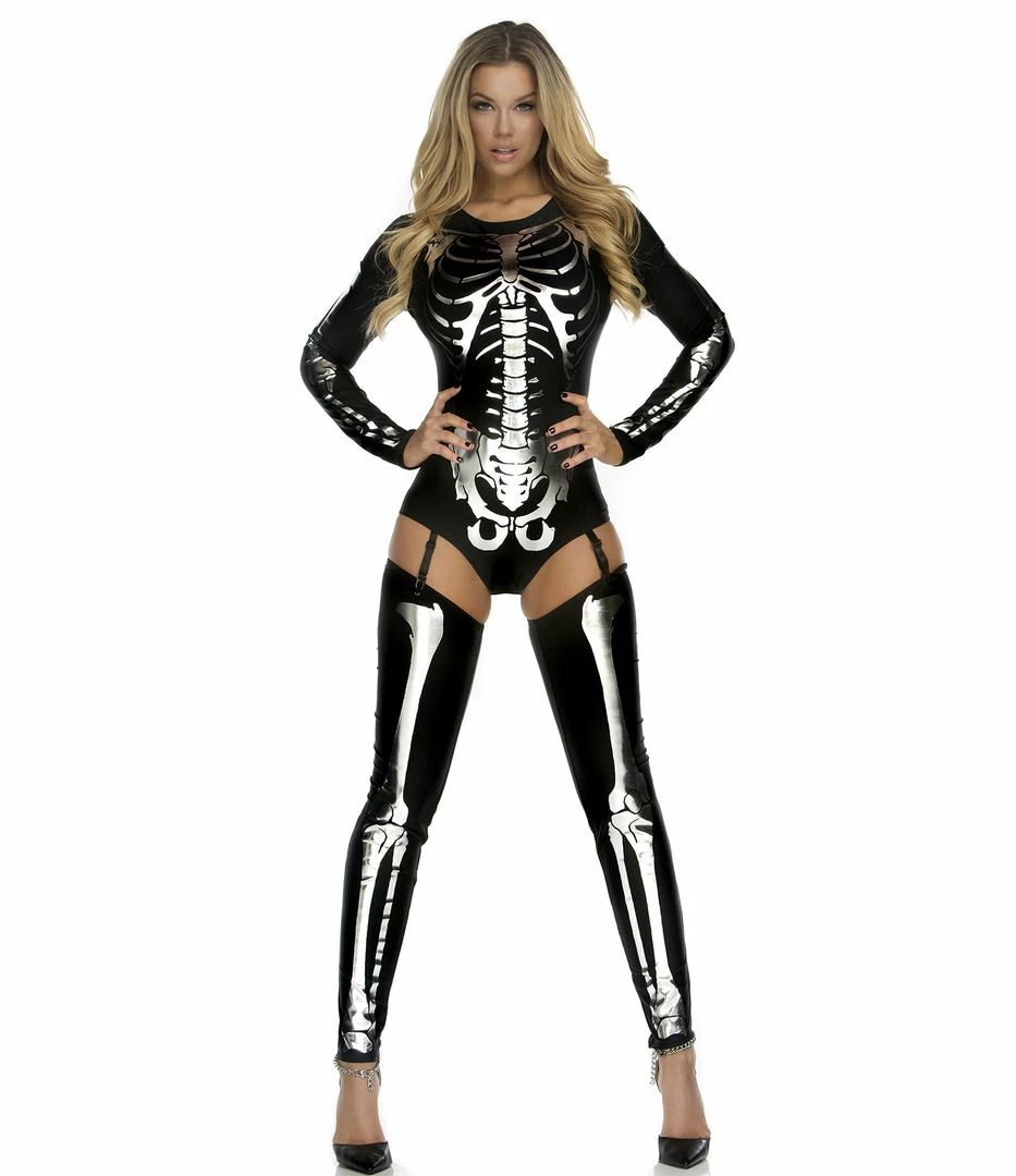 The black bodysuit is completed with adjustable garter straps and matching black thigh high stockings with matching metallic silver skeleton bone accents.
