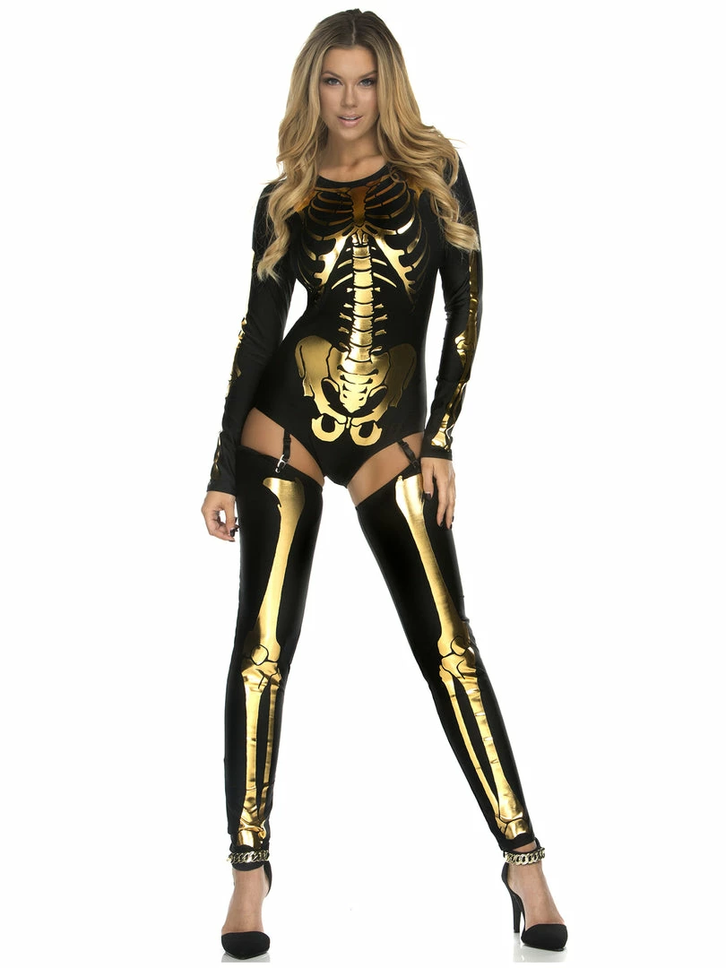 This bad to the bone Skin & Bones Skeleton Bodysuit Costume features a sexy long sleeve black bodysuit with a high scoop neckline and metallic gold Skelton bone print.Â