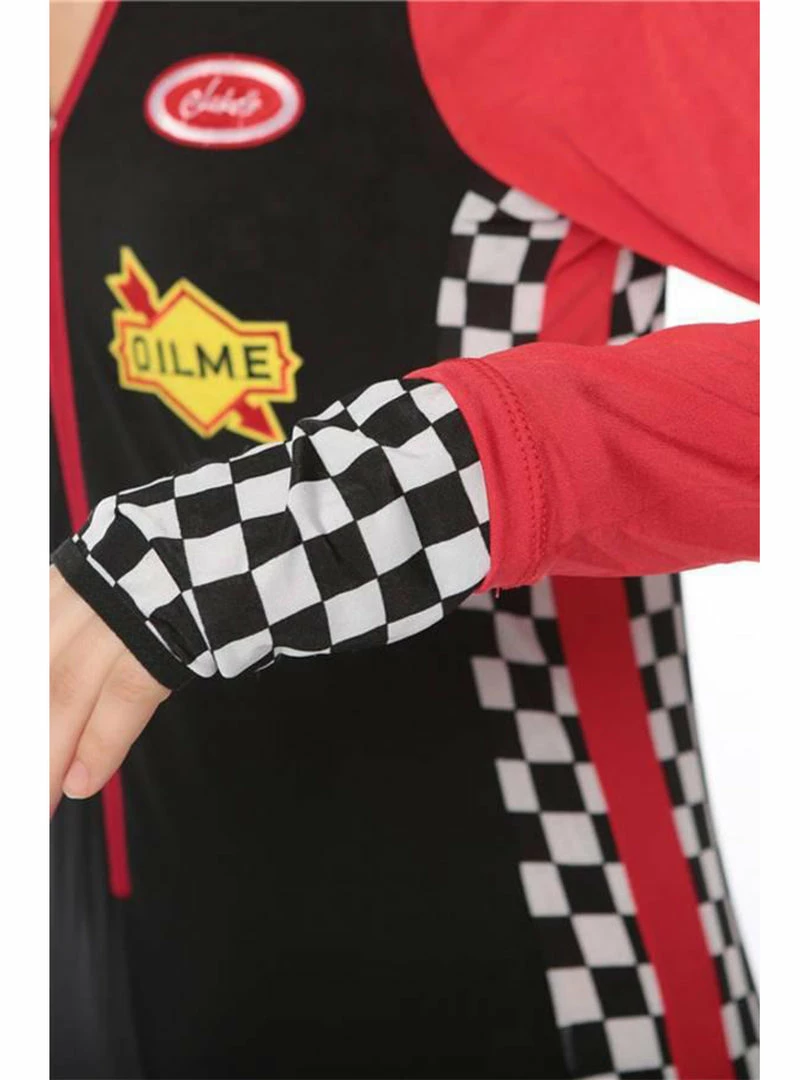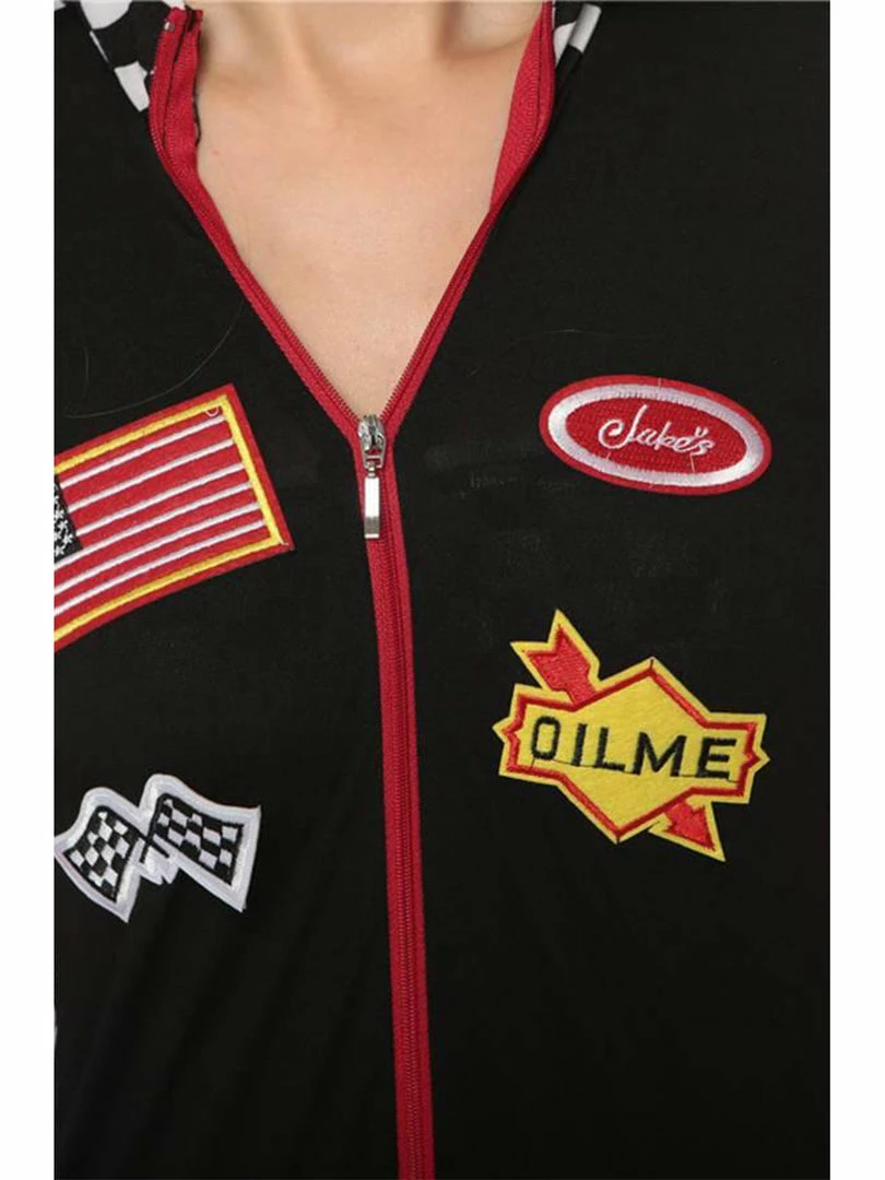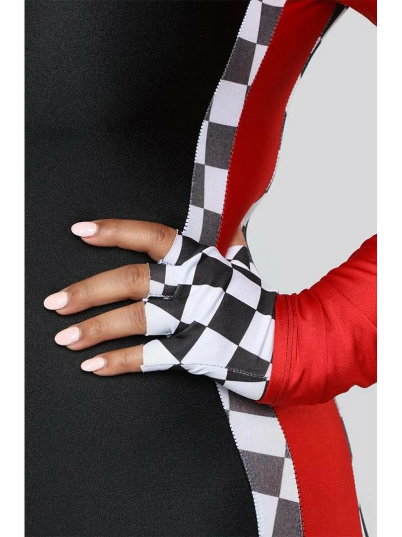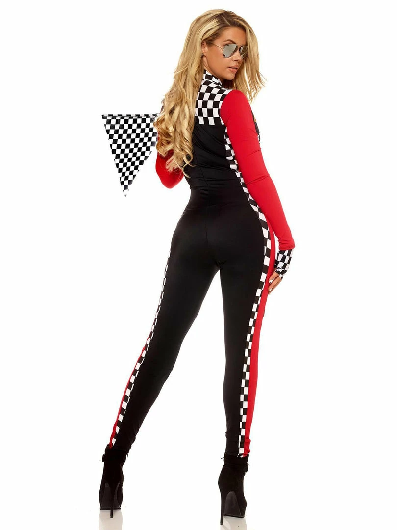 Speed your way to sexiness in this sexy racer costume! Ideal for your next sports themed fancy dress party or race car meet, this curve clinging zip-front checker print catsuit has attached patches, and comes complete with matching aviators and gloves!