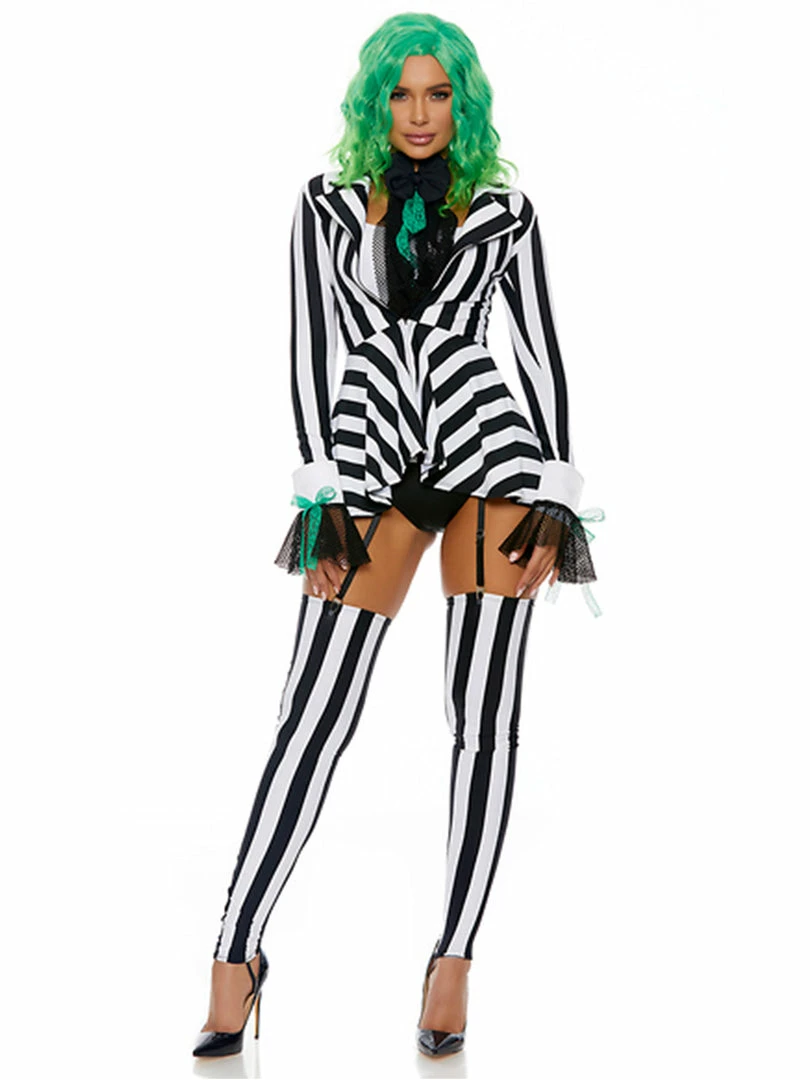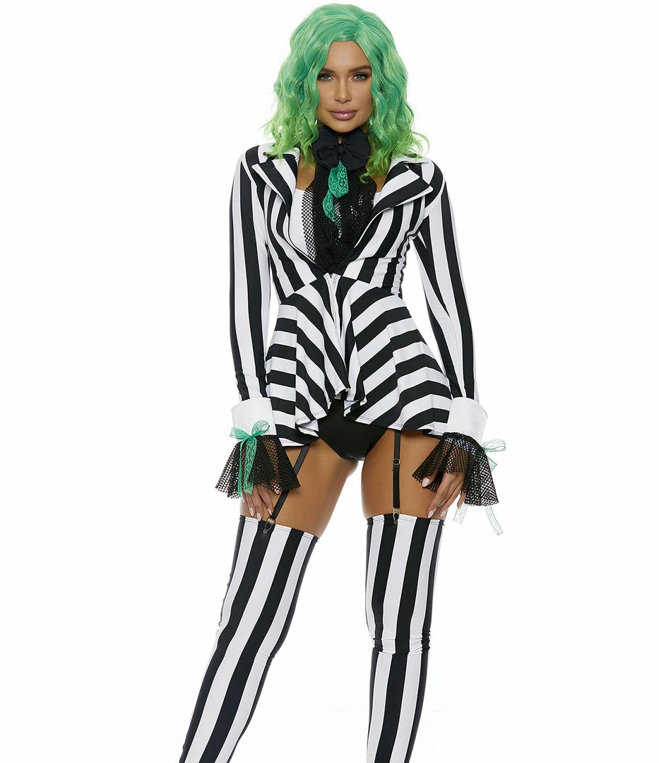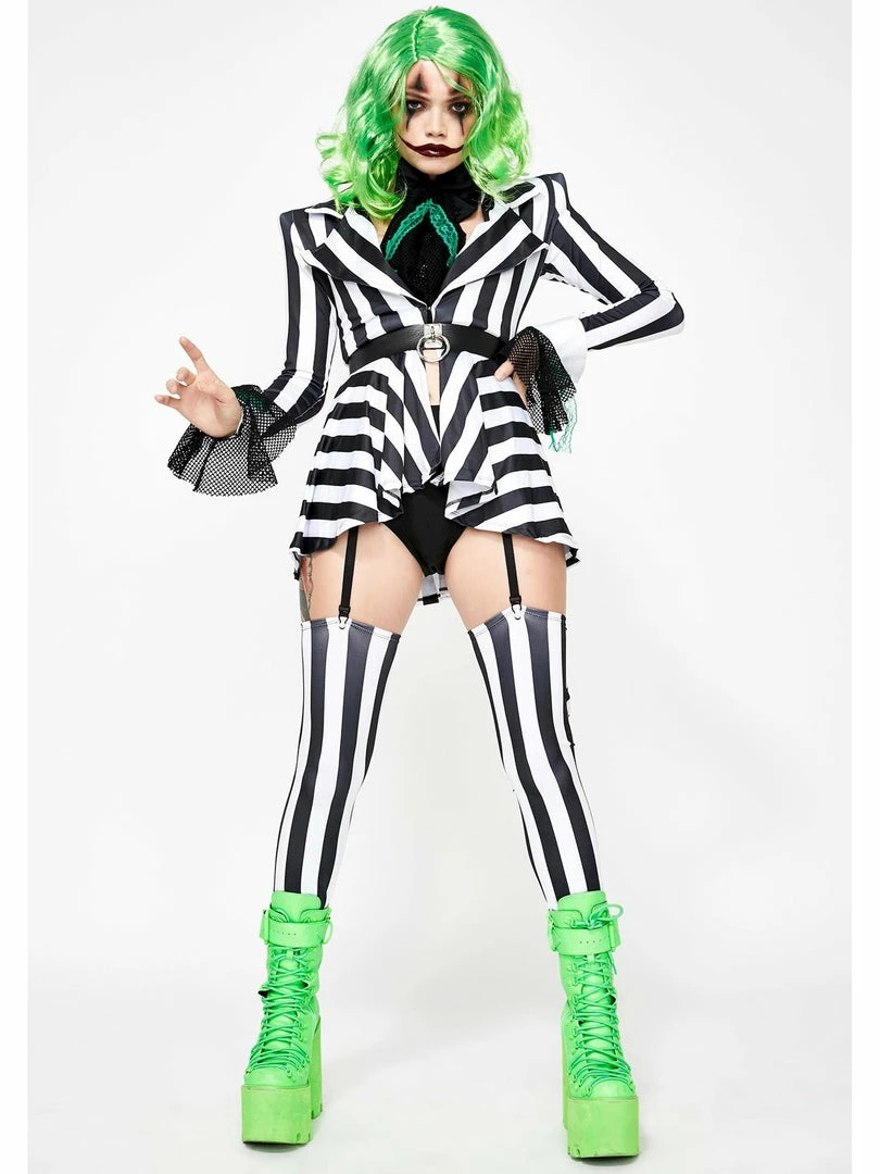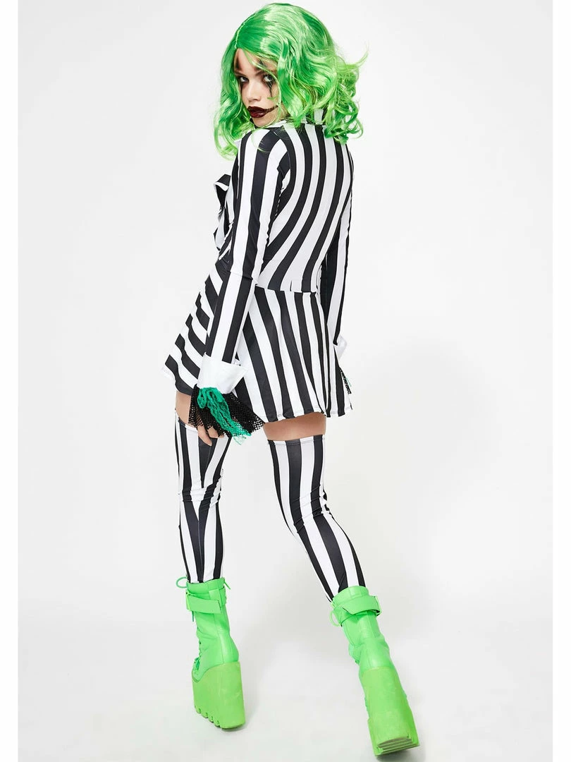 Be the ghost with the most, babe, in the iconic striped costume set inspired by the cult classic movie, Beetlejuice. Equal parts sexy and eery, this 6 piece Women’s Halloween Costume includes a classic Beetlejuice striped blazer style mini dress with a peplum bodice and mesh sleeve accents, cheeky panties with matching leg garters, a bra top, a bow tie choker, and a wavy neon green wig!