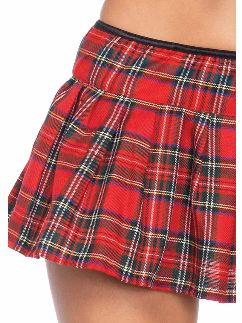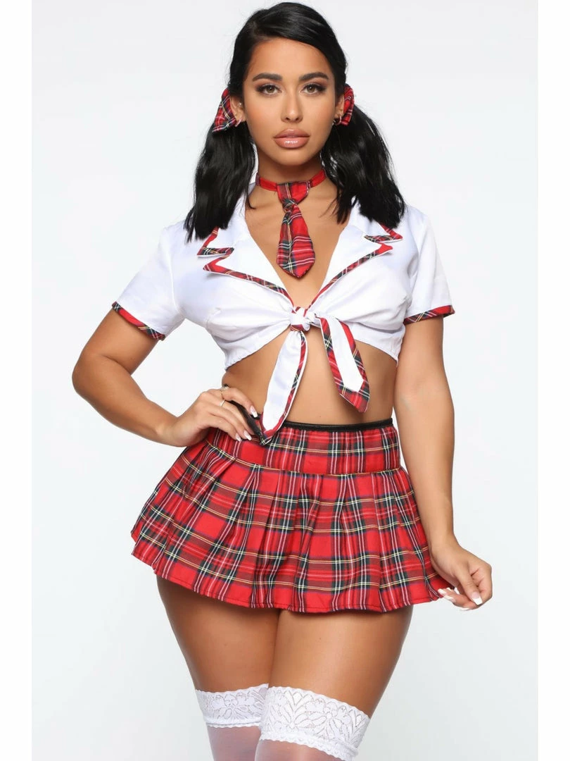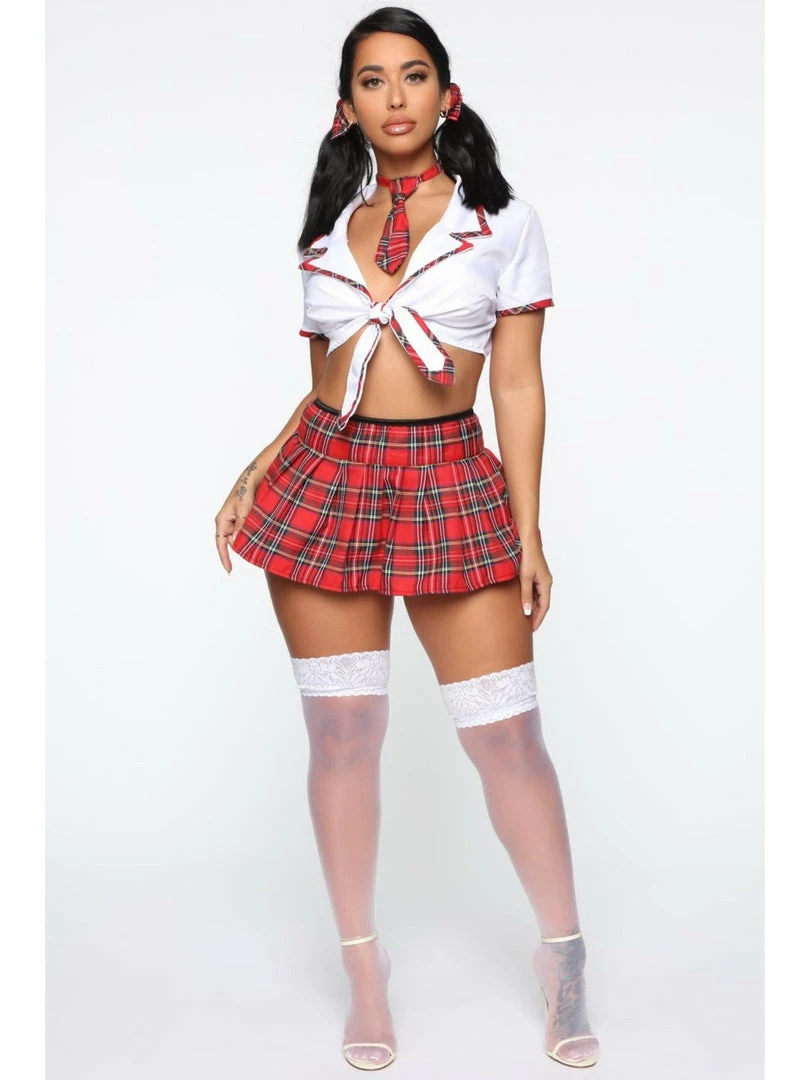 - White front tie crop top with red plaid trimming, matching red plaid mini skirt, matching red plaid tie and (2) red plaid hair bows.Â