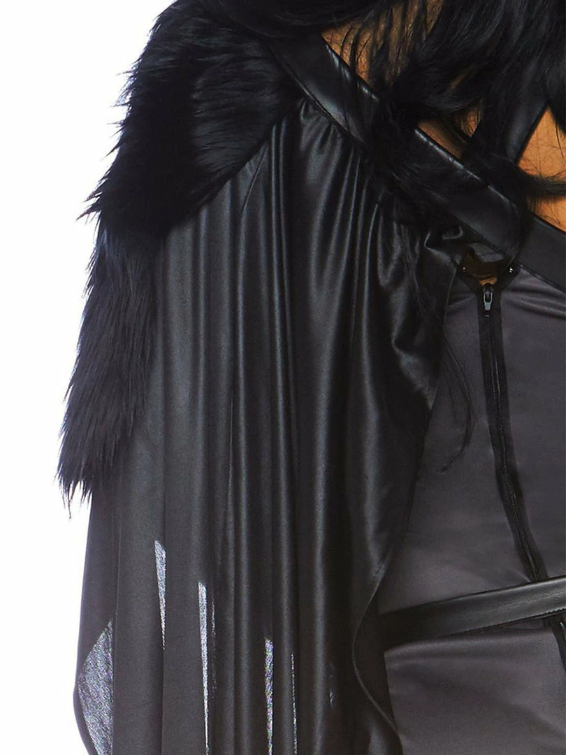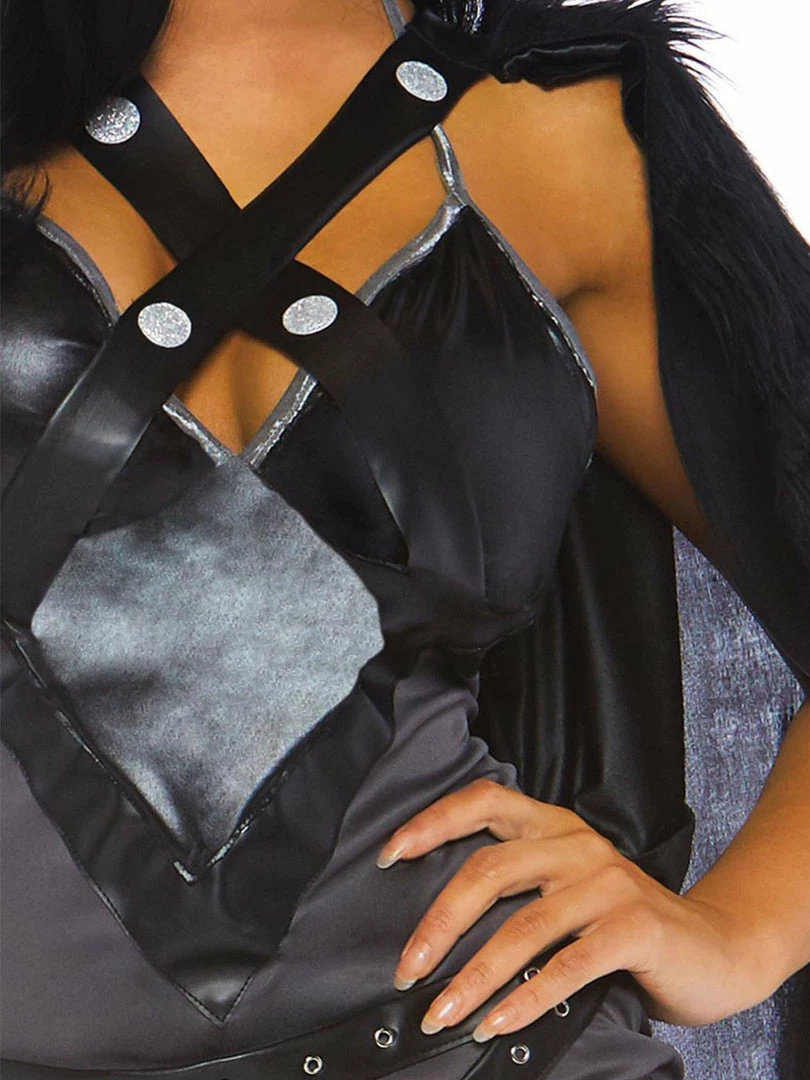 Ideal for Halloween, themed parties or reigning supreme, this skin-baring costume features a stretchy grey dress with a V-neckline, halter straps, black cups, a metallic silver bodice panel with a black trim, a back zipper closure, a double strapped belt with stud accents, an attached sequin panel belt, and a matching one-shoulder cape with a fur accent and criss-cross body straps.