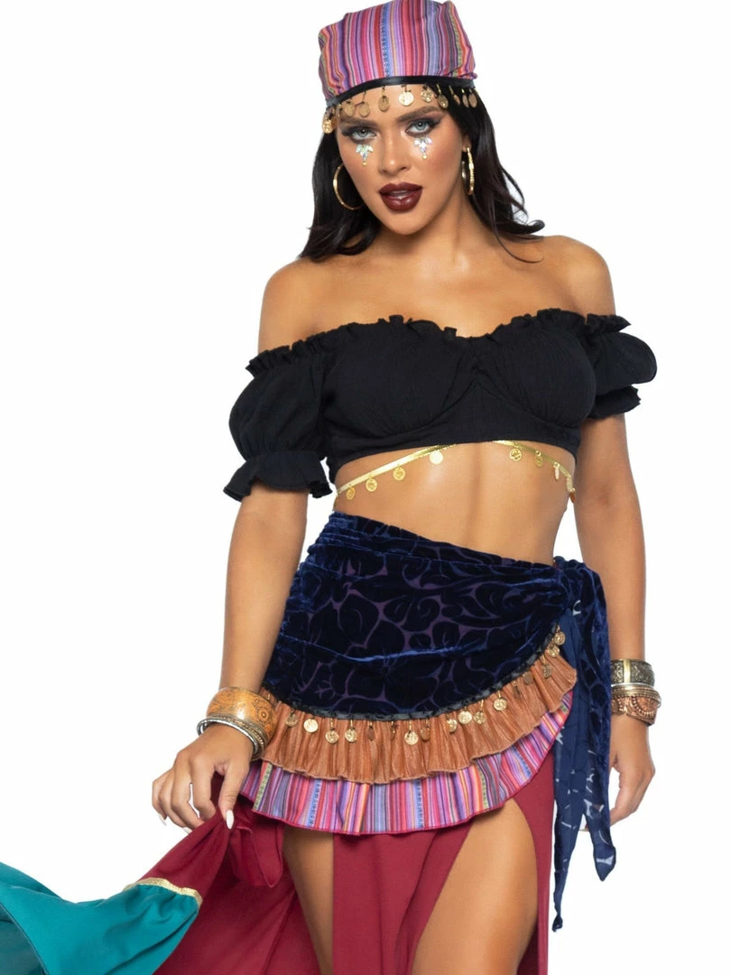 - 3-Piece Crystal Ball Beauty Gypsy Costume Set includes; Black coin trimmed crop top, an off-the-shoulder neckline, a maxi skirt with two front slits, a ruffled velvet sash, and a matching headscarf.
