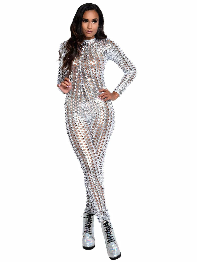- Package includes:Silver Metallic long sleeve catsuit with laser-cut accents and Zipper back for easy wear.