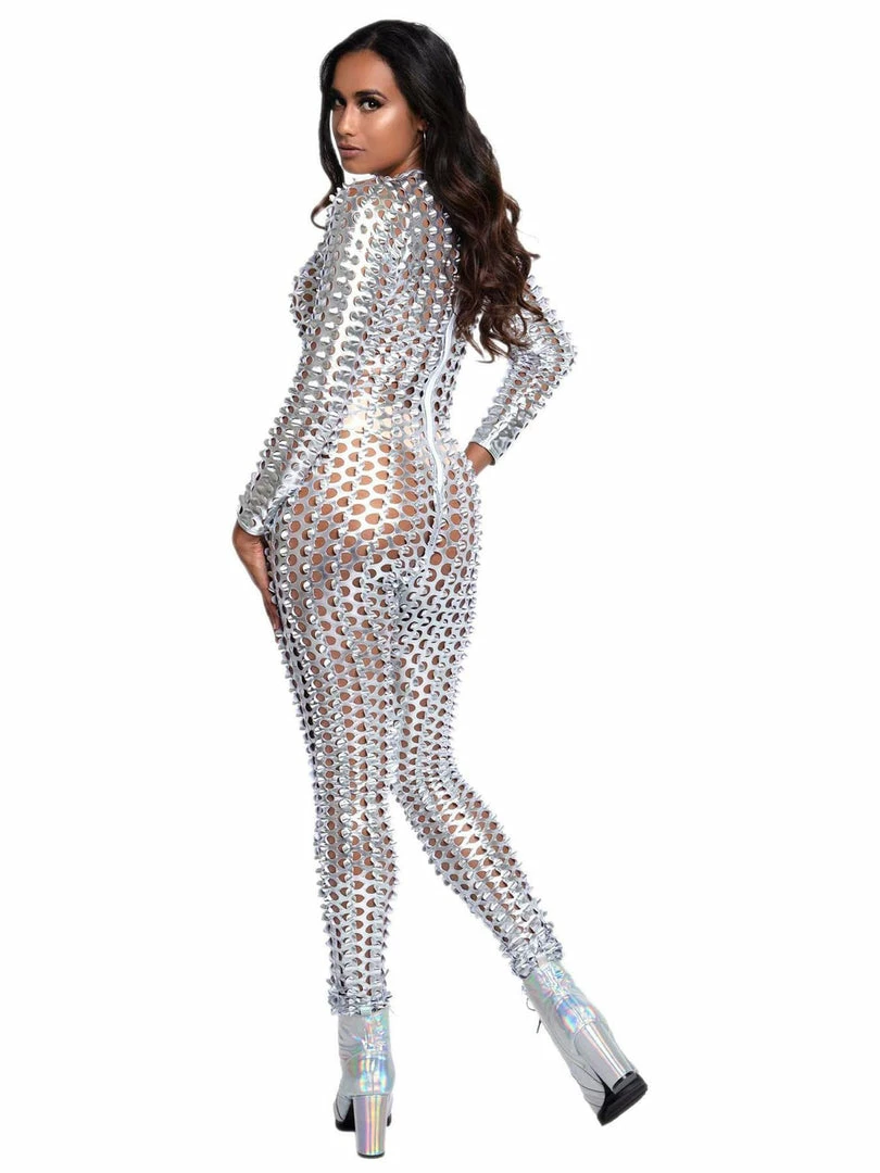 This curve-hugging catsuit will give you futuristic feels with its sleek, shimmering metallic fabric and the laser-cut accents give a sexy peek-a-boo effect that will be sure to make you stand out!