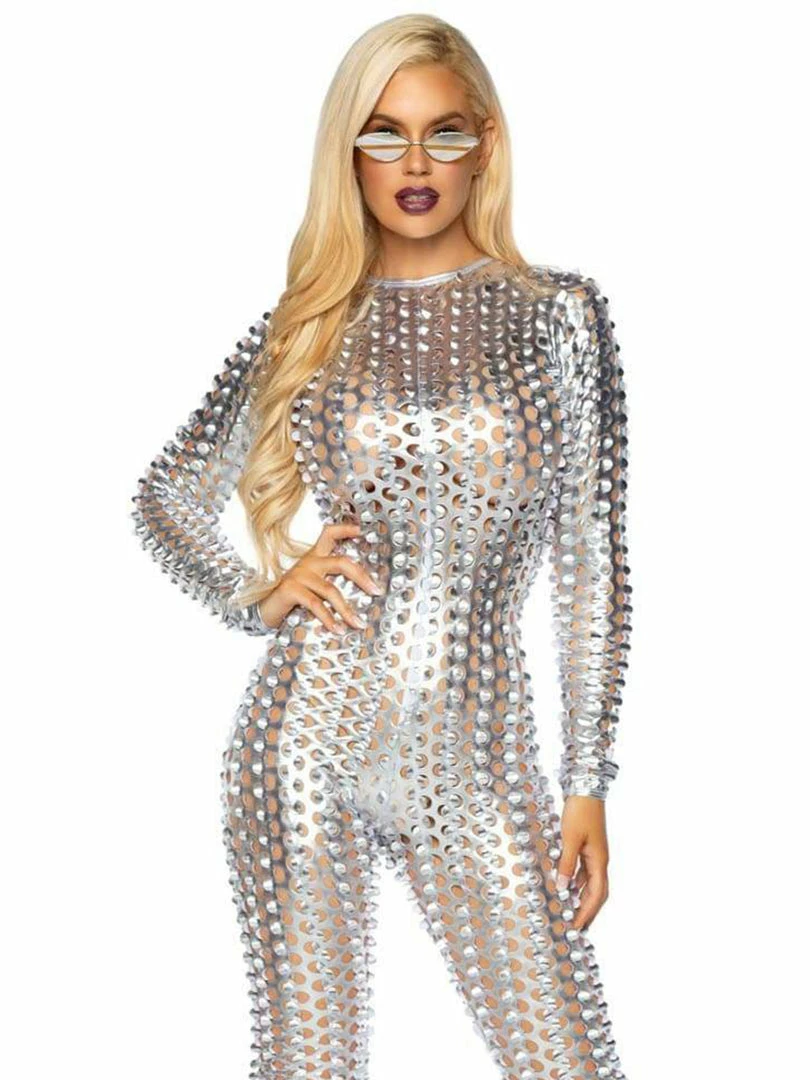 Trick or Treat this Halloween as a futuristic babe in this extraterrestrial Laser Cut Silver Metallic Catsuit by Leg Avenue!