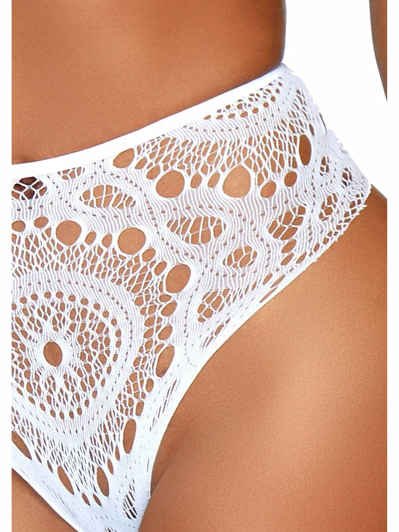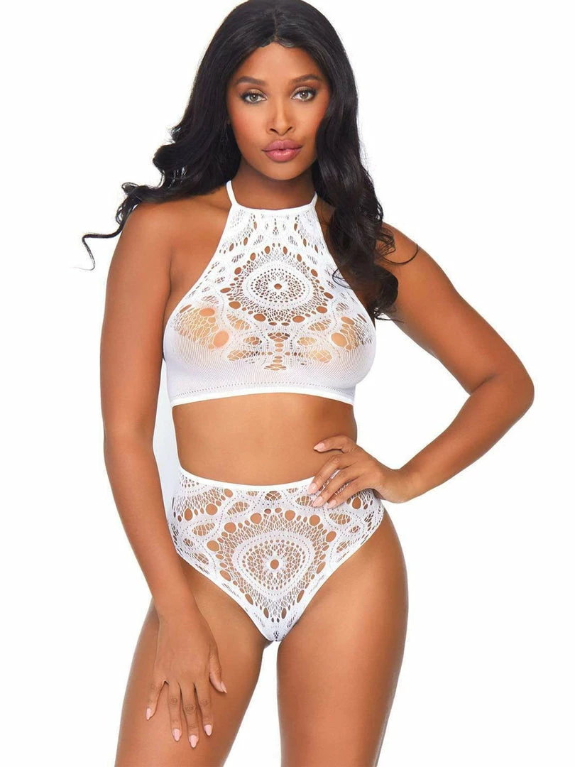 - 2 PC Crochet lace halter crop top with strappy back detail and matching high waist thong.