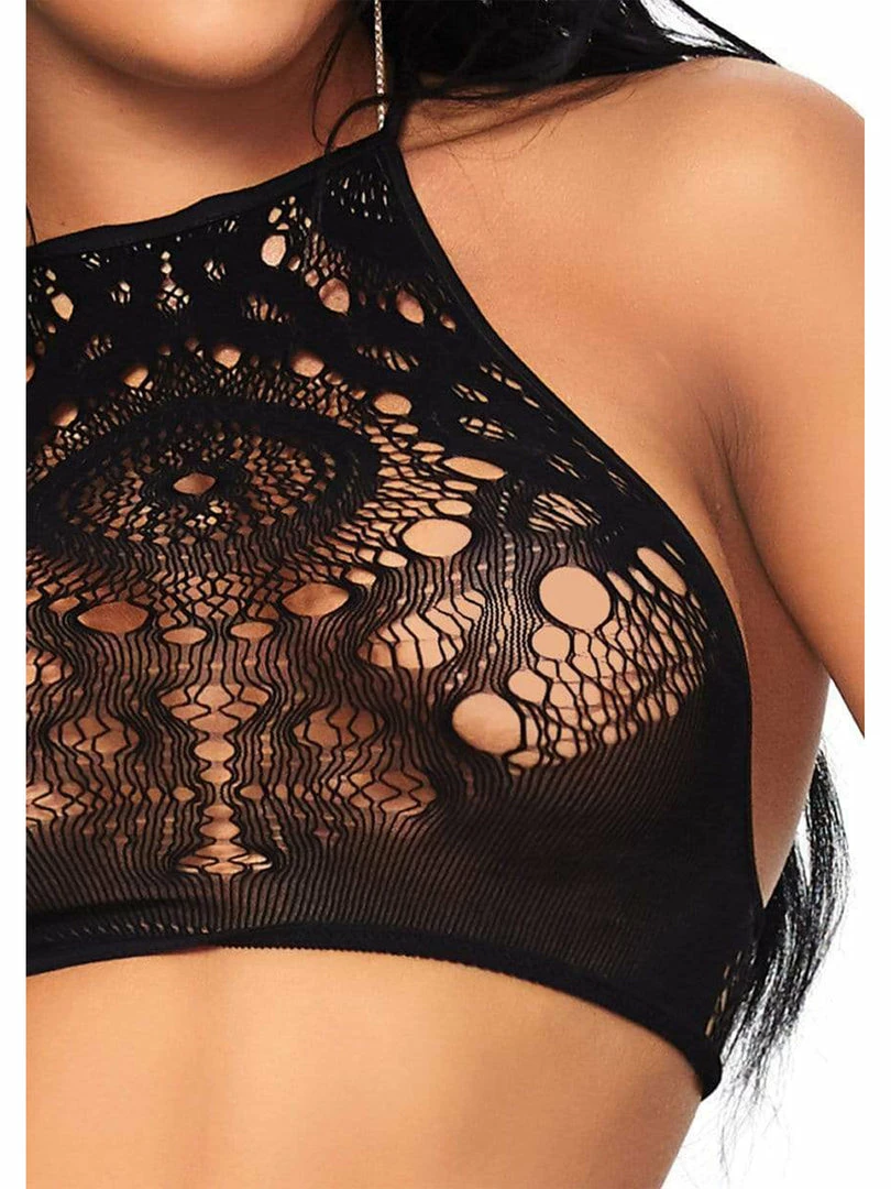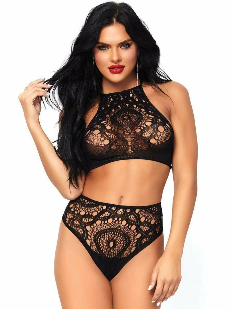 - 2 PC Crochet lace halter crop top with strappy back detail and matching high waist thong.