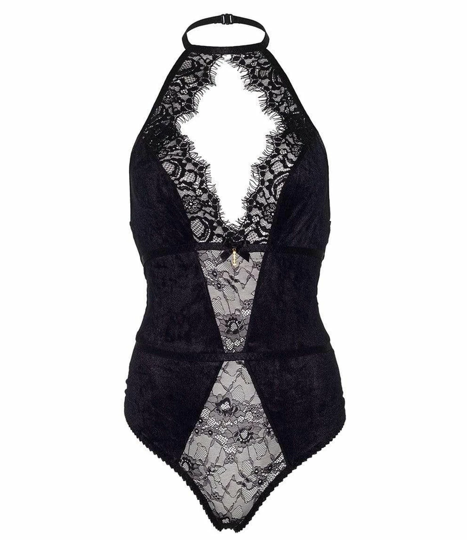 This velvety bodysuit will make you feel so powerful but so soft to touch! This body-hugging Black Velvet & Eyelash Bodysuit features ultra decadent stretch velvet, an eyelash lace keyhole centre detail and halter neck strap, stretchy ribbon waistband, sheer Brazillian back snap crotch panty, and hook-n-eye adjustable back strap.