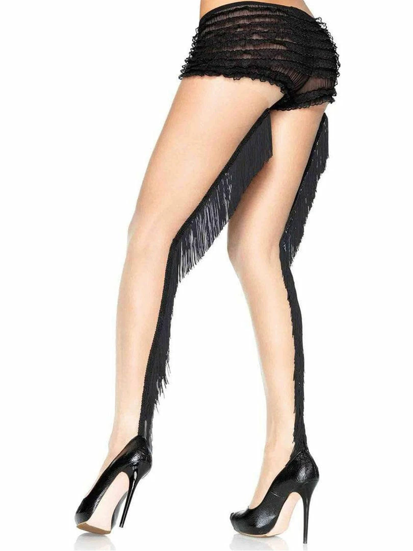 Ideal for a sexy burlesque look, or to compliment your downtown doll Gatsby costume; these hot pantyhose are made from a sheer nude construction with a backseam fringe design and high waist stretchy fit!