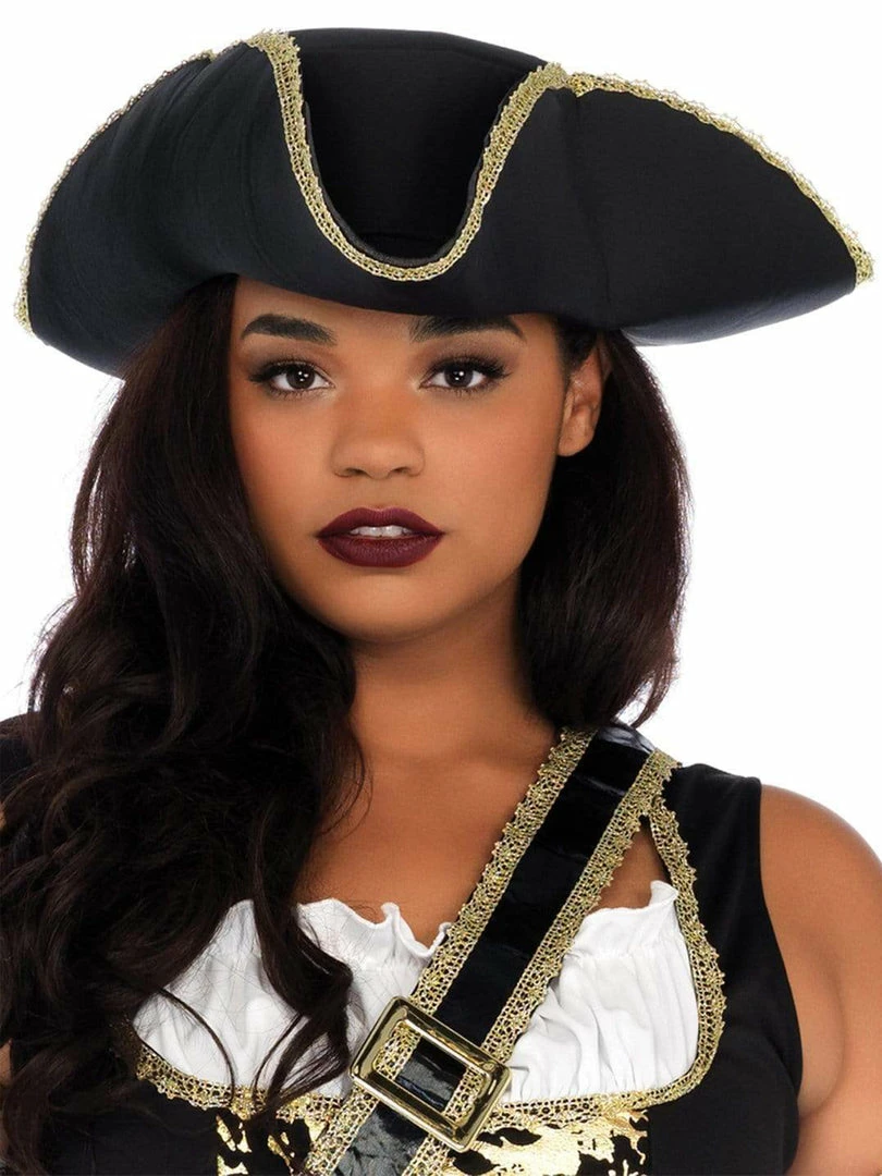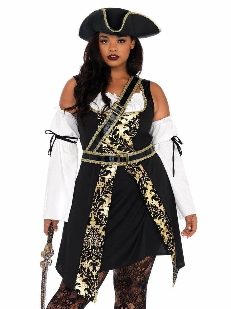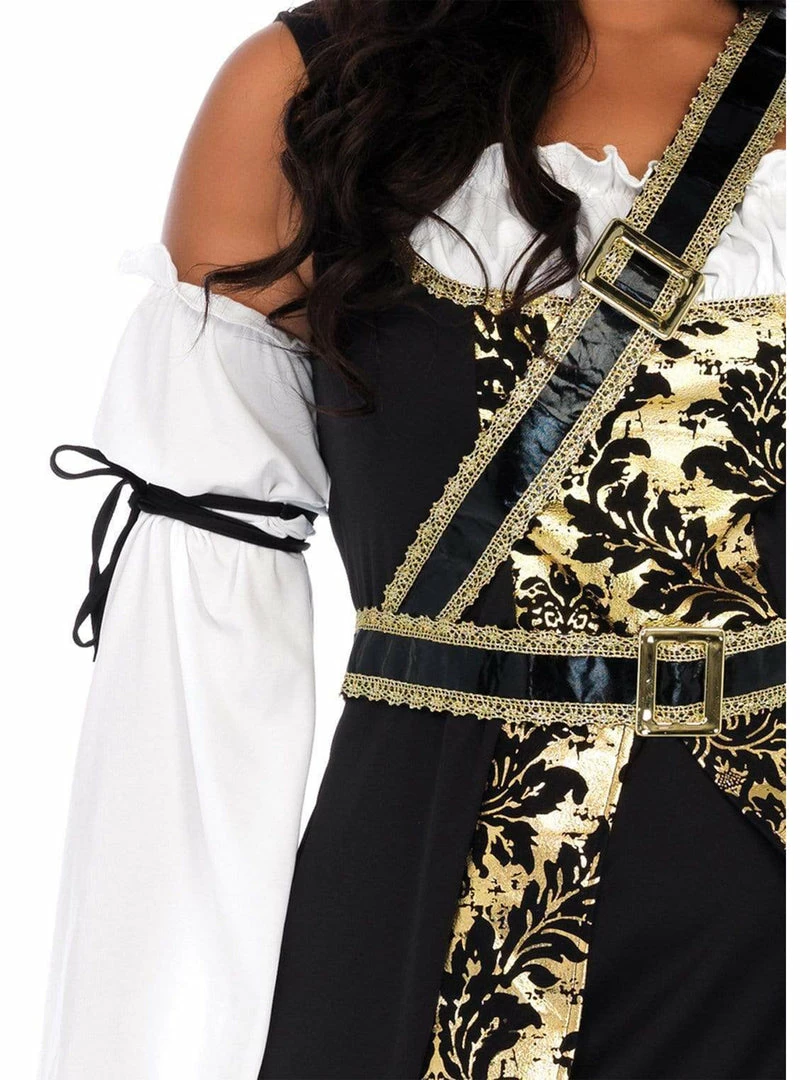 Featuring a black stretch dress with velcro closure and ruffled fabric on the bustline with gold braid trim, you’ll be the finest pirate booty they’ve ever laid eyes on! Complete with decadent gold brocade trim and off the shoulder sleeves with wrap accents, this costume includes a crossbody buckle belt and matching hat with gold trim. This deluxe quality women’s sexy plus size pirate outfit will rock the boat!