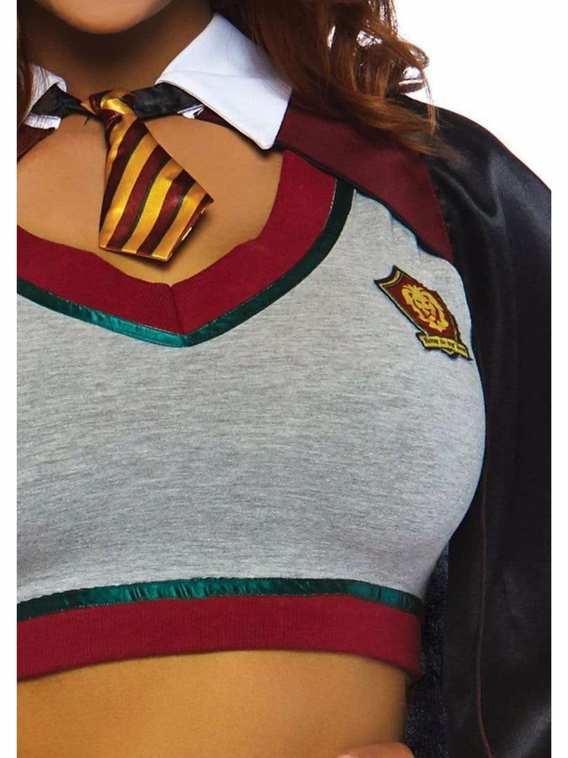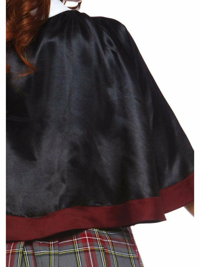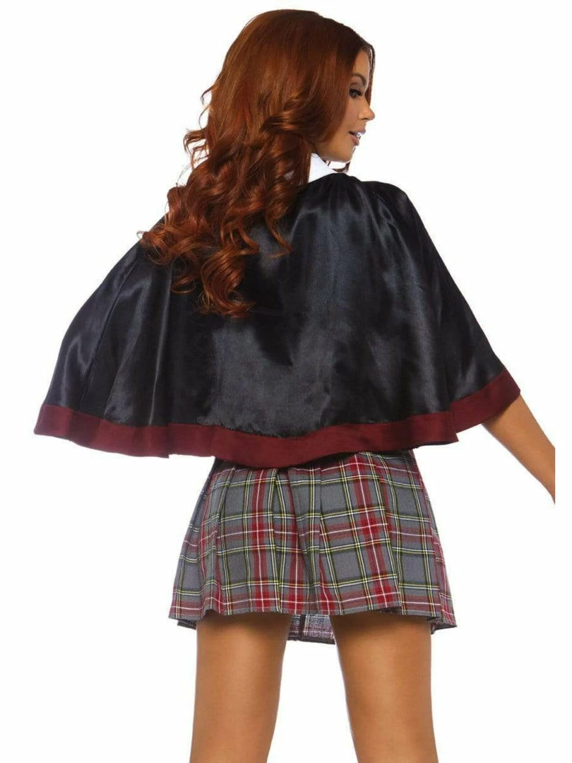 This Hogwarts style schoolgirl costume features a grey crop top with a red trim, a V-neckline, badge accents, a high waisted skirt with a gold waistband, a pleated design style with a plaid design, and includes black cape with deep red trim. You’re sure to earn high marks in all your classes while wearing this spellbinding outfit!