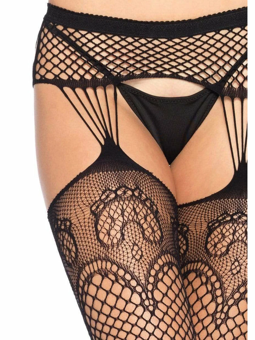 Shine under the spotlight in these sexy fishnet thigh-high stockings with floral lace details and an attached multi-strand suspender garter belt.